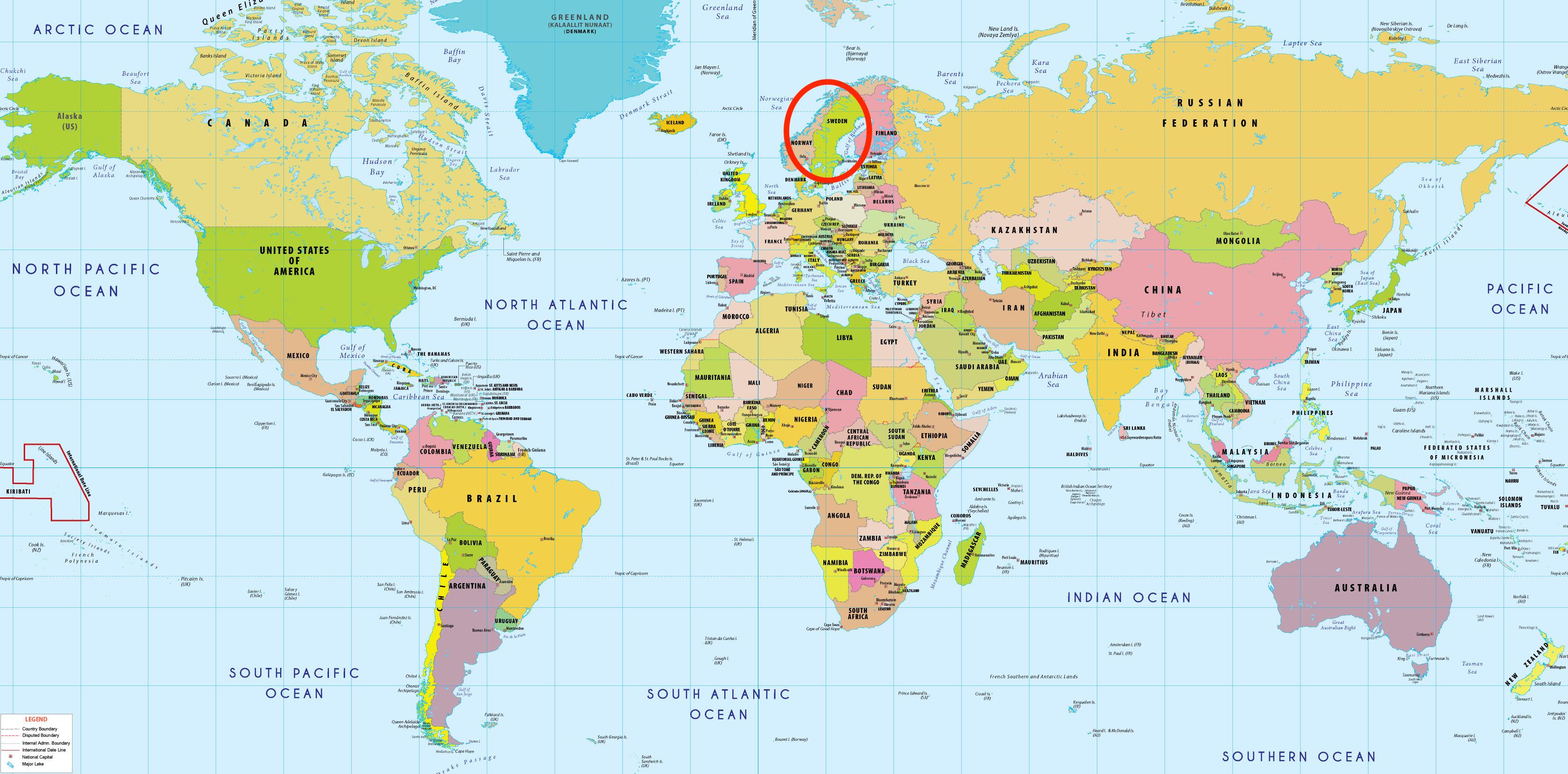 Швеция на карте мира. Швеция карта мира (Северная Европа - Европа) для печати. Швеция карта мира (Северная Европа - Европа) для загрузки. Швеция занимает восьмое место в мире по доходу на душу населения. В 2011 году она заняла четвертое место в мире по Индексу экономистской демократии и десятое - по Индексу развития человеческого потенциала Организации Объединенных Наций (третье место по ИРЧП с поправкой на неравенство), что отражено на карте мира Швеции. В 2010 году Всемирный экономический форум поставил Швецию на второе место в мире по конкурентоспособности после Швейцарии.